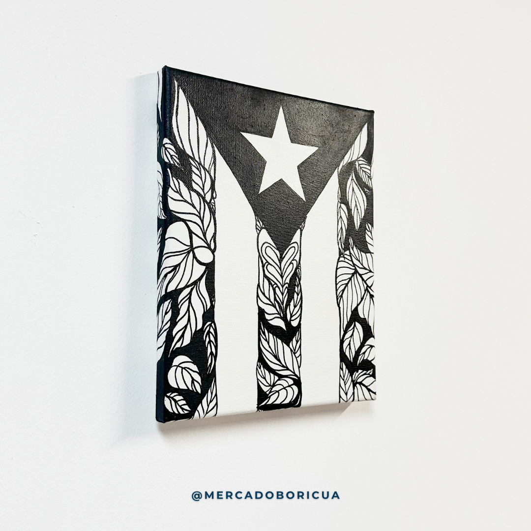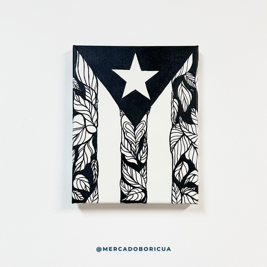 Show your Puerto Rican pride! This handmade Puerto Rico flag features an artistic version of the black version of the flag. Designed with colorful leaves and greenery, it has been painted using an 8x10 canvas. Impress your friends with your Puerto Rican pride!
