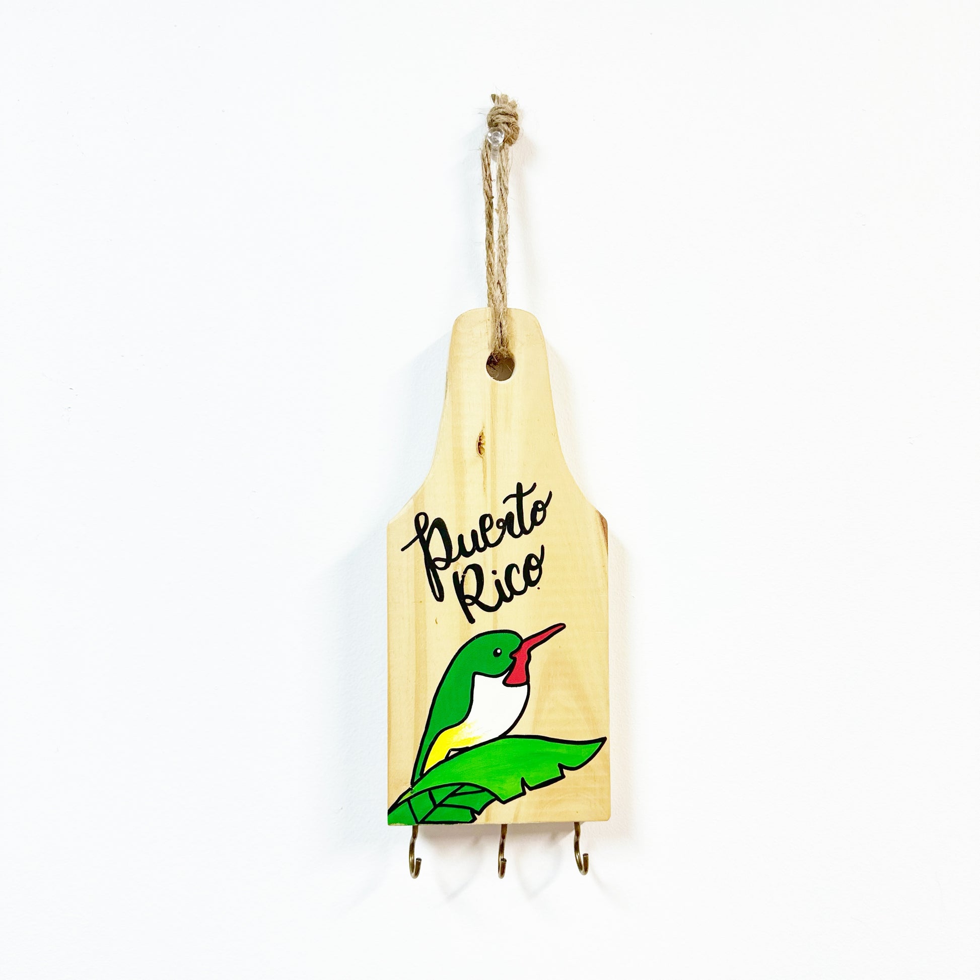 Organize your keys in a practical and decorative way with this handcrafted wooden key holder. It is handcrafted from sturdy wood and comes with an easy-to-hang lanyard. It also has a hand-painted design of banana leaves with a San Pedrito (Bird of Puerto Rico) to decorate your wall. Organize what you need with a touch of Puerto Rican pride!