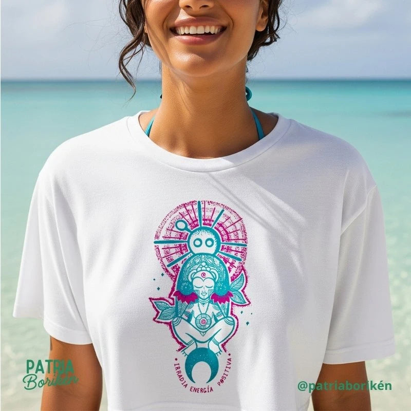 El diseño es una celebración de la energía y la simbología taína: Atabey, la figura central, se alza majestuosamente sobre una luna creciente para representar la poderosa energía femenina, mientras que un sol taíno brilla sobre su cabeza, simbolizando la fuerza vital. La pieza se completa con la inspiradora frase "Irradia energía positiva", que te invita a llevar un mensaje de poder y luz.