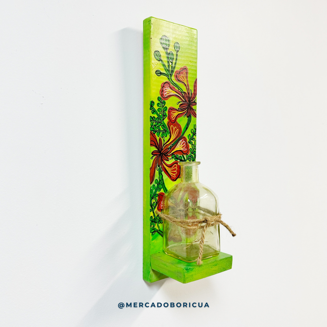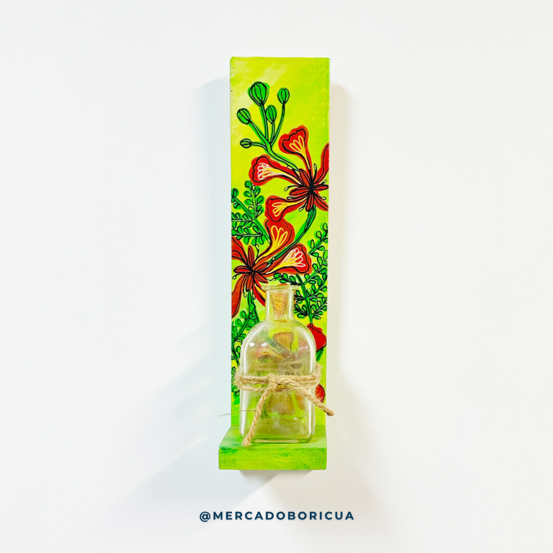 Disfruta de este diseño único y pintado a mano de una placa de madera. Esta pieza cuenta con un diseño de flores del árbol de Flamboyán para añadir un toque natural a tu hogar. Esta pieza es perfecta para crear un ambiente alegre y colorido en tu espacio. Incluye una botella de cristal que puedes utilizar para propagar plantas. Pintada a mano, esta placa de madera seguro cautivará a tus invitados. Ubicala en un lugar de interior o exterior y disfruta!