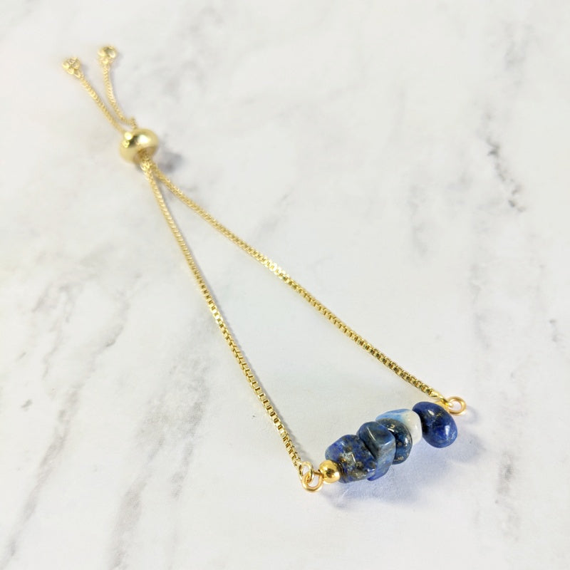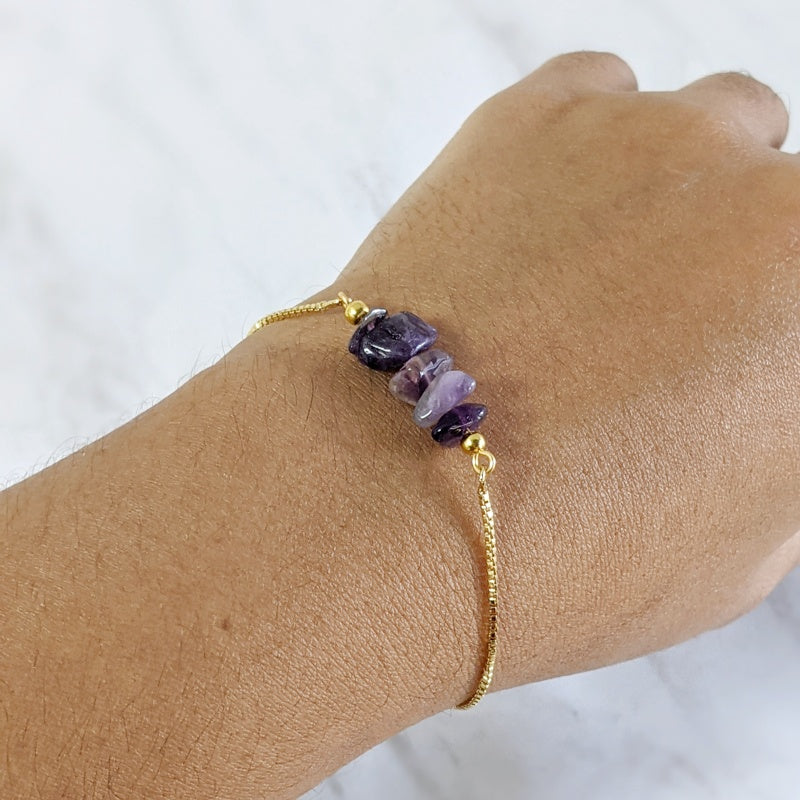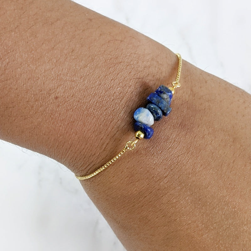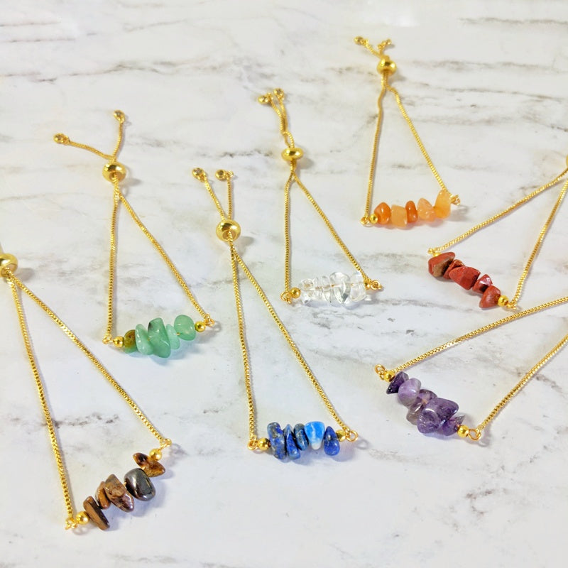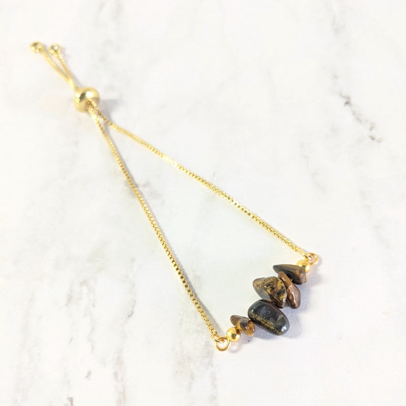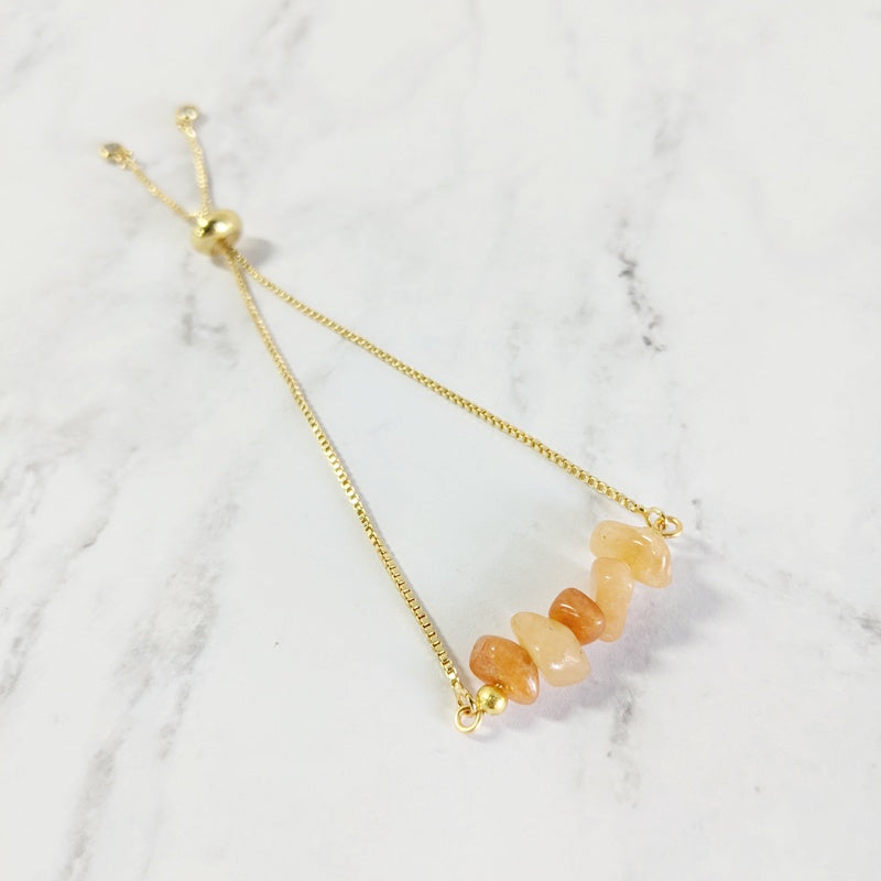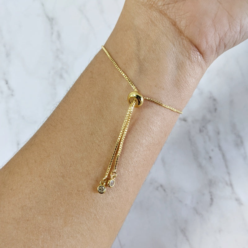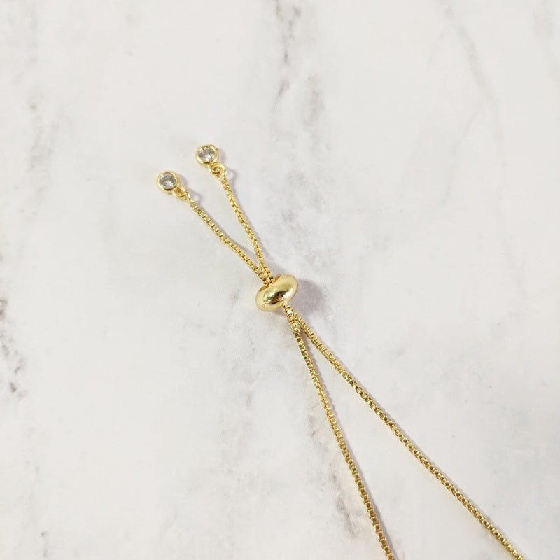 Hermosa pulsera de piedras semi preciosas con cadena con ajuste deslizante enchapada en oro 18K con extremos en zirconias. Excelente opción de regalo para cualquier ocasión gracias a su estilo delicado y elegante.