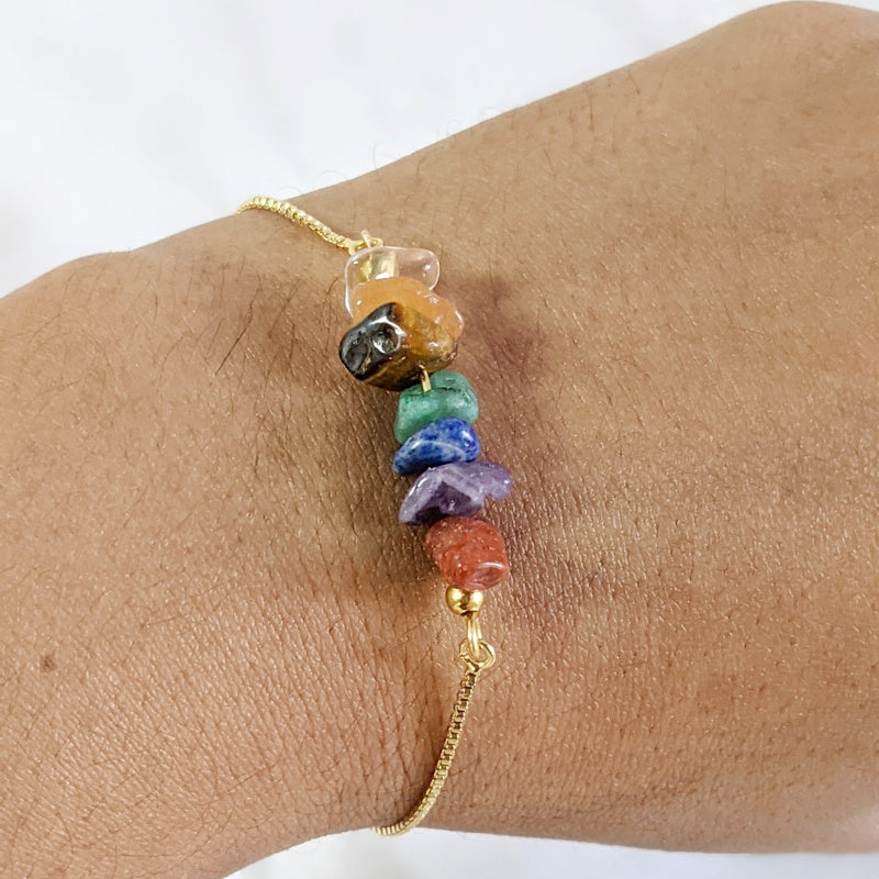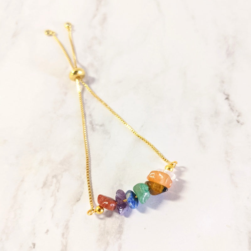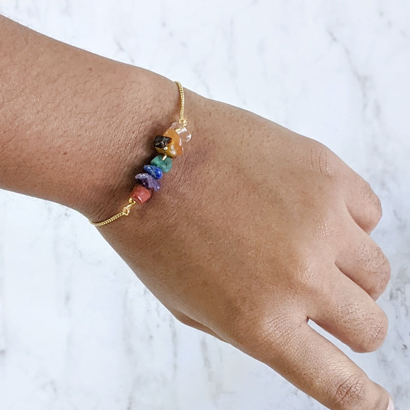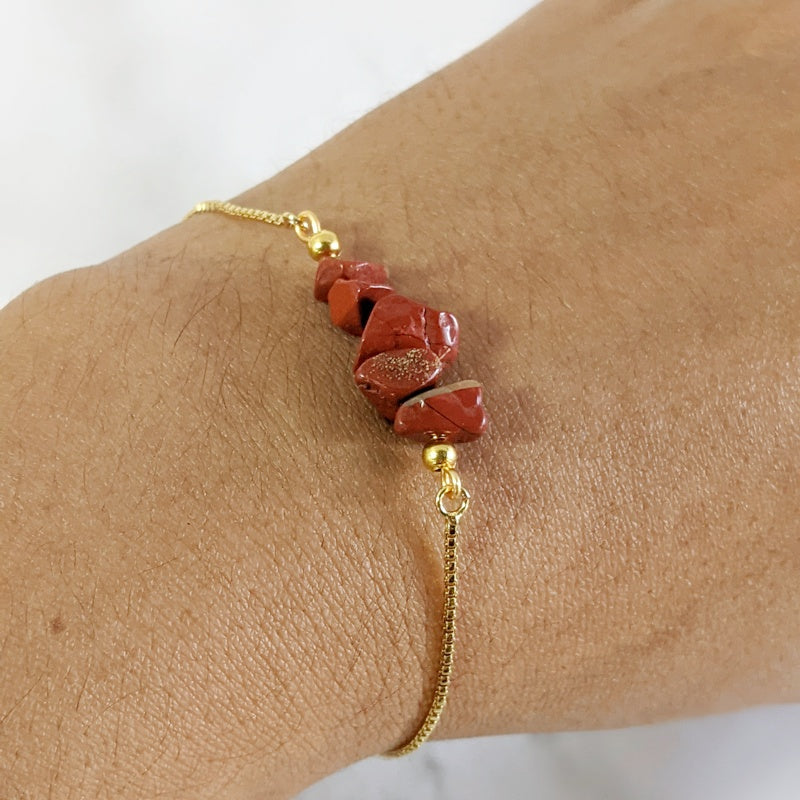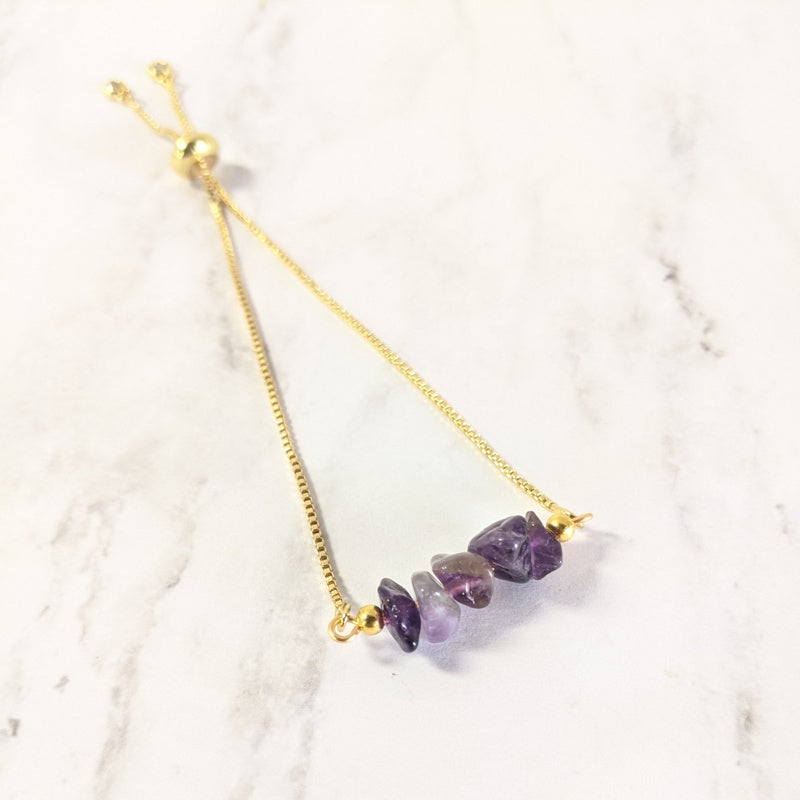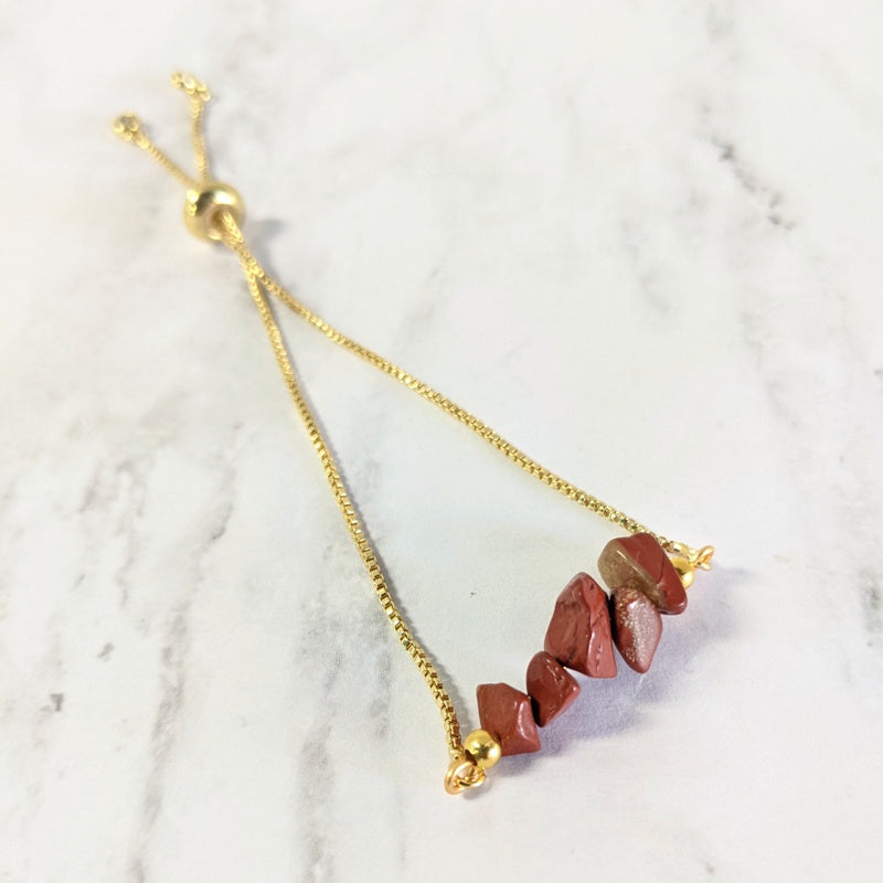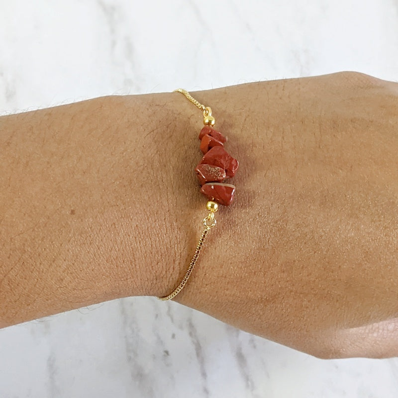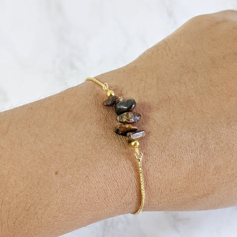 Hermosa pulsera de piedras semi preciosas con cadena con ajuste deslizante enchapada en oro 18K con extremos en zirconias. Excelente opción de regalo para cualquier ocasión gracias a su estilo delicado y elegante.