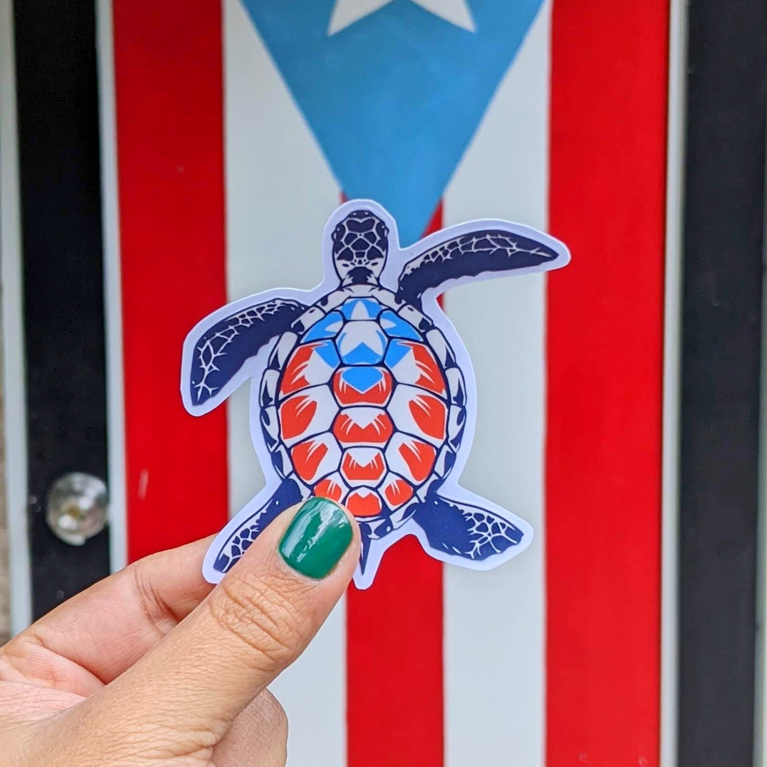 Celebra la belleza de nuestra vida marina y el orgullo patrio con este Sticker de la Tortuga Carey con la Bandera de Puerto Rico. La Tortuga Carey (Eretmochelys imbricata) es un tesoro de nuestras costas, y este diseño único la presenta llevando los colores de nuestra bandera, combinando la conservación marina con la identidad nacional.