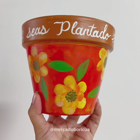 Este tiesto de barro terracota está pintado a mano con hermosas flores amarillas sobre un fondo en tonos de naranja. La frase "Florece donde seas plantado" en el borde te recordará que siempre puedes crecer y prosperar donde te encuentres. Añade un toque de color y sofisticación a tu jardín o interior con esta pieza única.