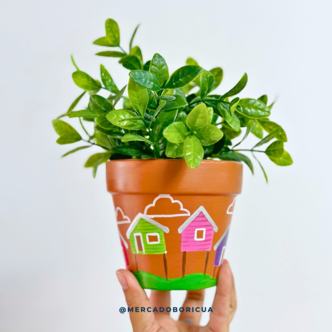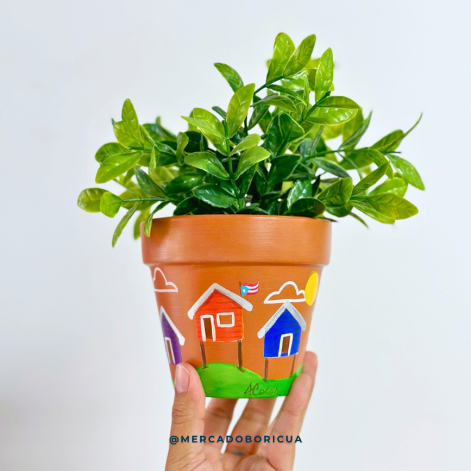 ¡Añade un poco de calor puertorriqueño a tu hogar! Estos hermosos tiestos pintados a mano son la perfecta combinación de cultura tradicional y estampado moderno. La puerta pintada con la bandera de Puerto Rico ahora se puede lucir en tu casa con este tiesto pintado, ¡así que úsalo para darle color a tu espacio!