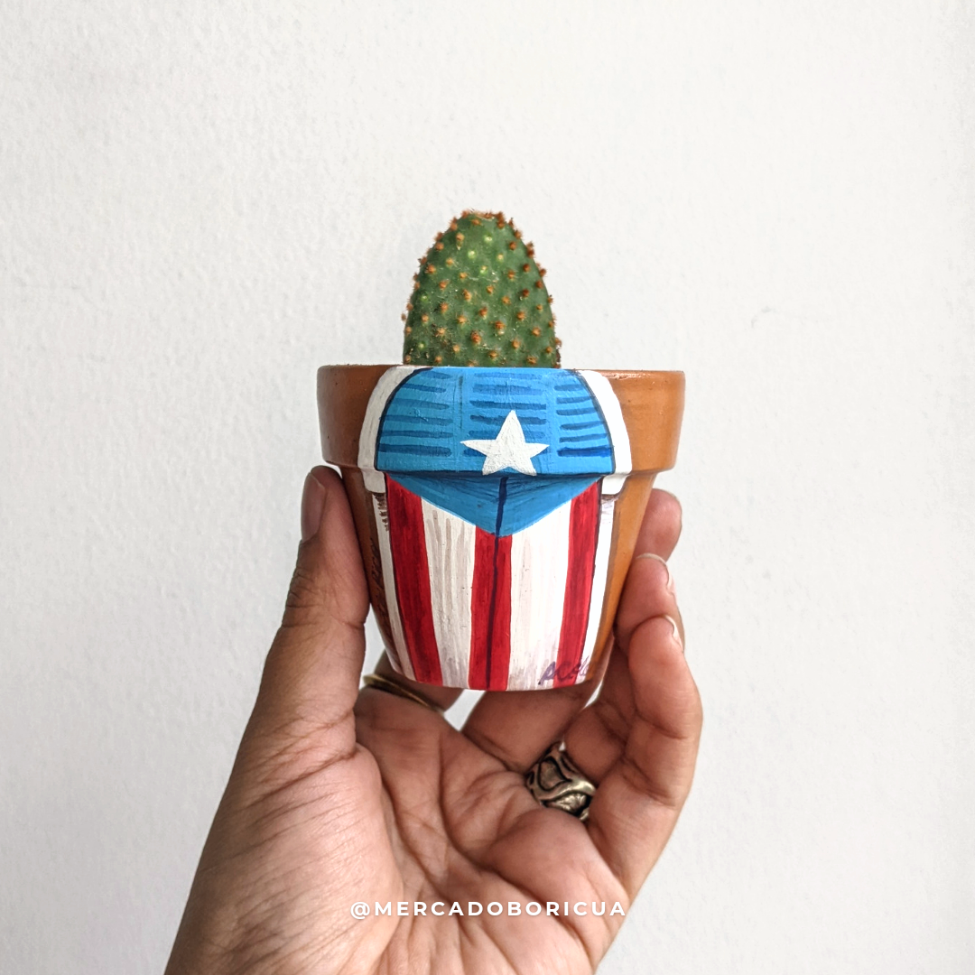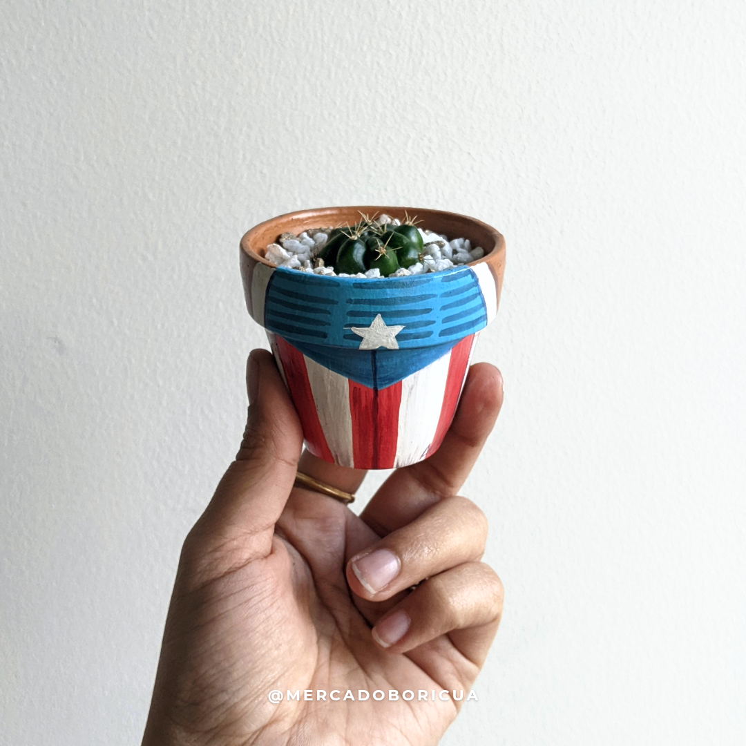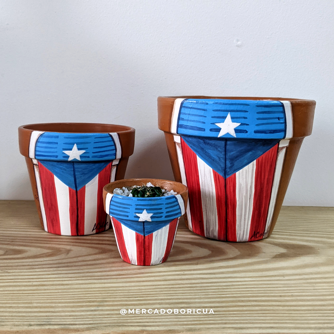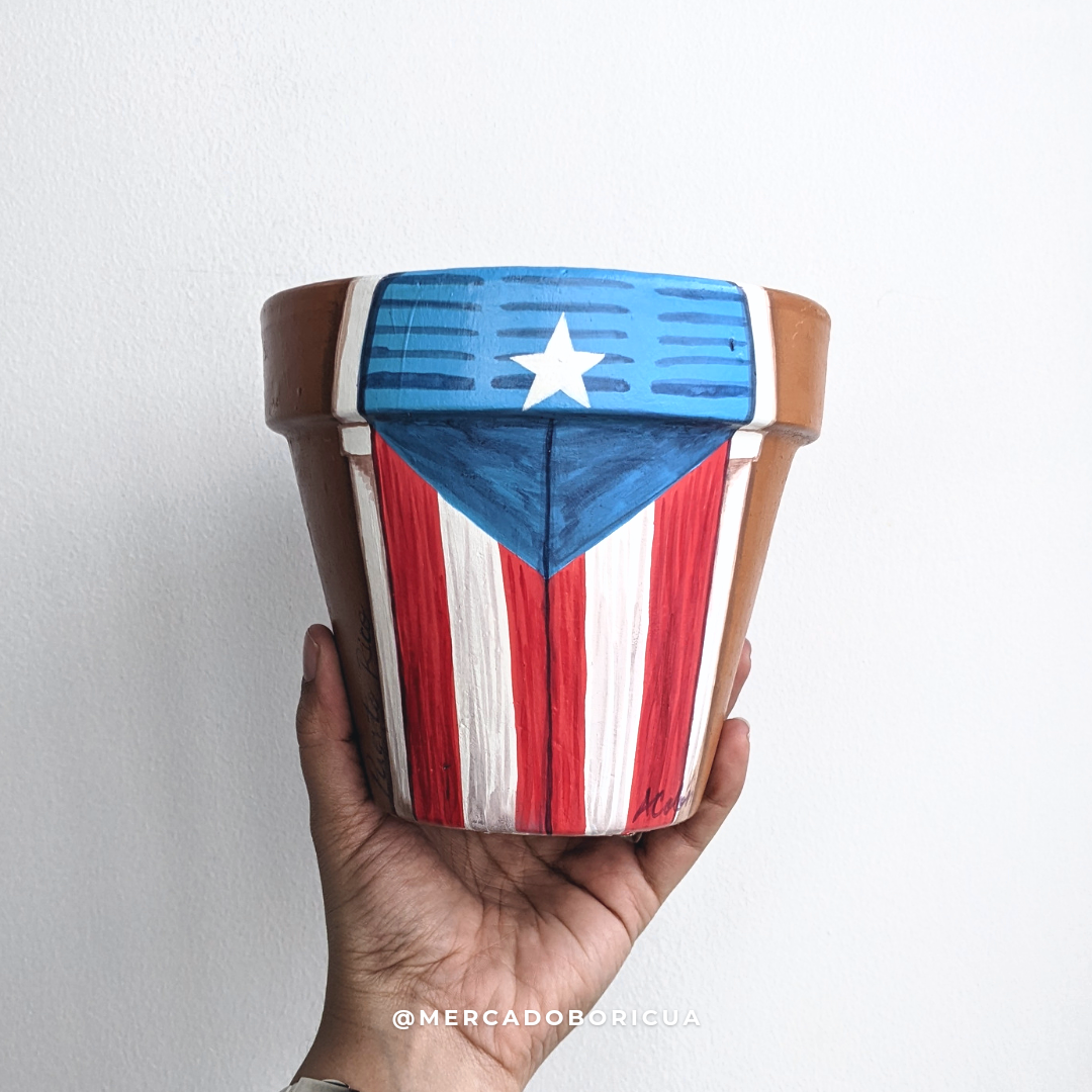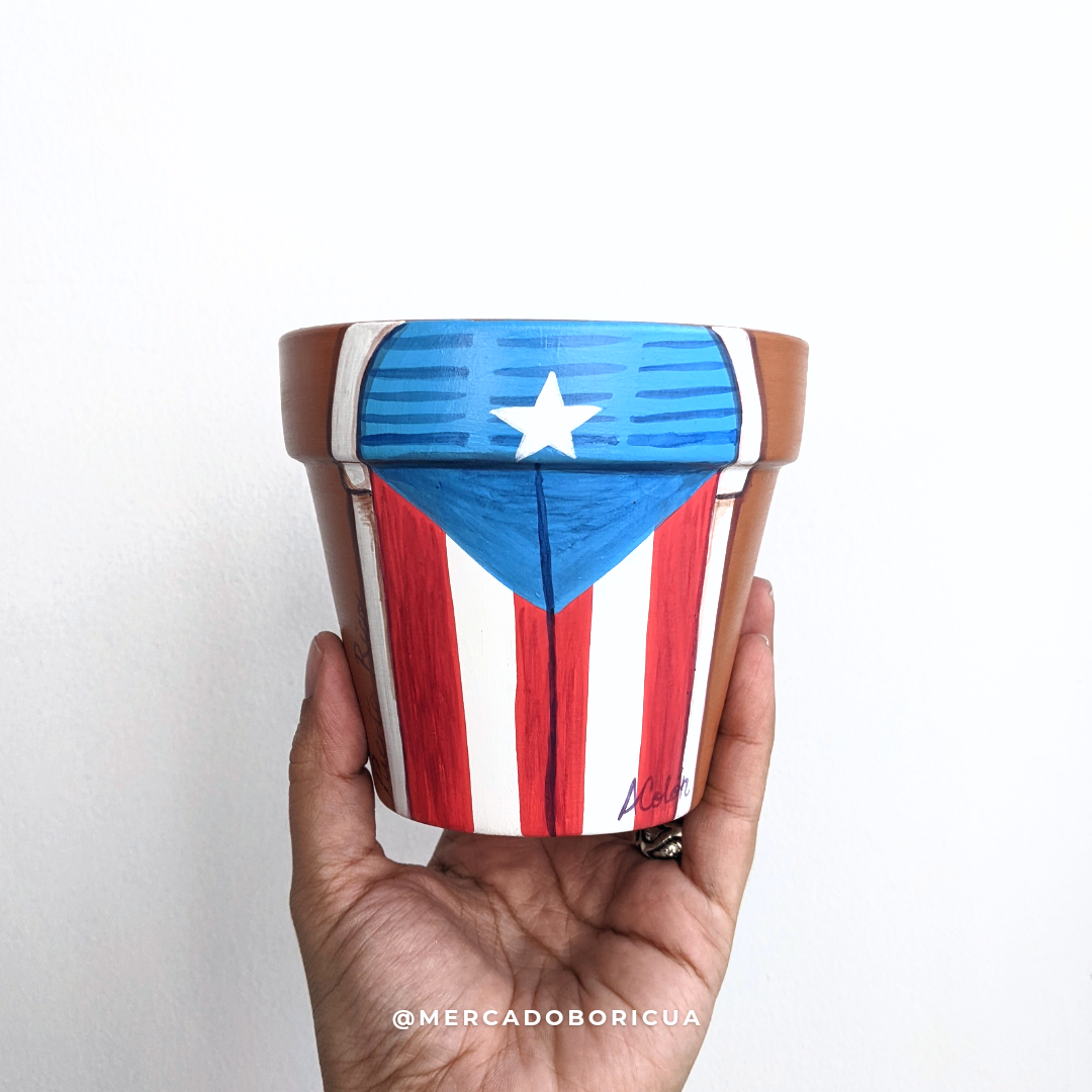 ¡Añade un poco de calor puertorriqueño a tu hogar! Estos hermosos tiestos pintados a mano son la perfecta combinación de cultura tradicional y estampado moderno. La puerta pintada con la bandera de Puerto Rico ahora se puede lucir en tu casa con este tiesto pintado, ¡así que úsalo para darle color a tu espacio!